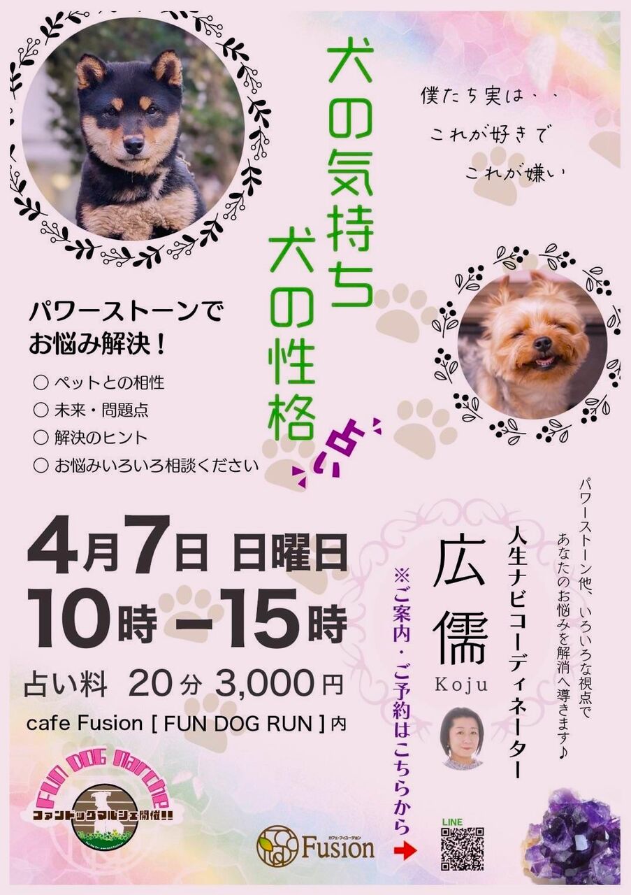 4月7日(日)10時~15時 cafe Fusion [FUN DOG RUN]内に於いて「犬の気持ち犬の性格」と題し人生ナビコーディネーター広儒さんの占いが行われます。とても人気がありますので御予約はお早めに!事前にお願いすればご自身の占いも良いようです。